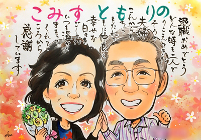 この度はステキな似顔絵をありがとうございました。先日、両親の還暦祝いで描いていただいた似顔絵を渡してきました。