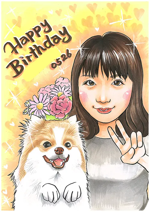 もし彼女がペットを飼っていたら、ペットと一緒に描いた誕生日祝い似顔絵は非常に喜ばれます。犬、猫、うさぎ等どのようなペットも対応可能です。大好きなペットも彼女の誕生日ををお祝いしている似顔絵は、きっとお部屋に飾りたくなる宝物となります。