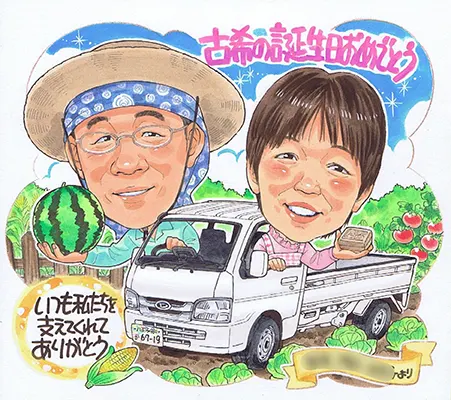 「感謝状風にしてほしい」「おじいちゃんは釣りが好きだから釣りをしているポーズにしてほしい」など、オーダーメイドだからこそお客様のイメージを似顔絵に表現できます。