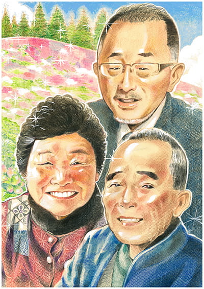 両親の金婚式の記念に、記念写真風の似顔絵を書いていただきました。