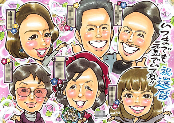長寿祝いなら優しい雰囲気、結婚式なら晴れやかな雰囲気など、お客様のプレゼントする際のシチュエーションをイメージしながら、喜ばれるプレゼントとなるよう似顔絵をお描きしています。