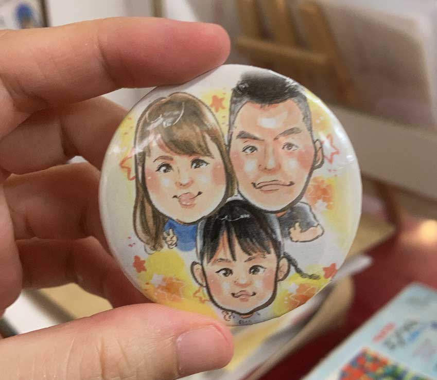 目の前で描いてもらった似顔絵を缶バッジにすることができます!