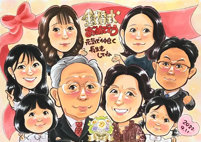 大変遅くなりました!無事に金婚式のお祝いも済み、その際に似顔絵も渡すことができました!両親はもちろん、みんな大変喜んでおり、似顔絵は実家の居間に飾っております(^^)今回は本当にありがとうございました\(^o^)/