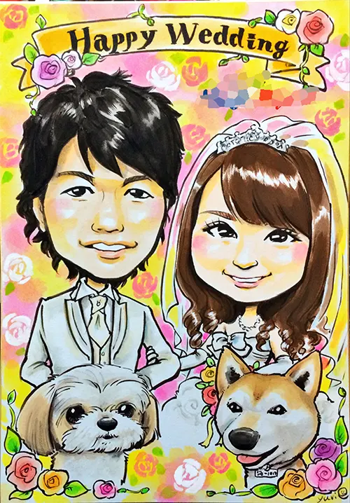 大好きなペットと一緒に行った思い出の地を背景にしたり、結婚式場の雰囲気に合わせた背景を取り入れるのもおススメです。基本的に構図も自由にオーダーいただけますので、お気軽にご相談ください。サンプルのように現実では難しい構図も、似顔絵ならペットと一緒に自由度高く表現できます。